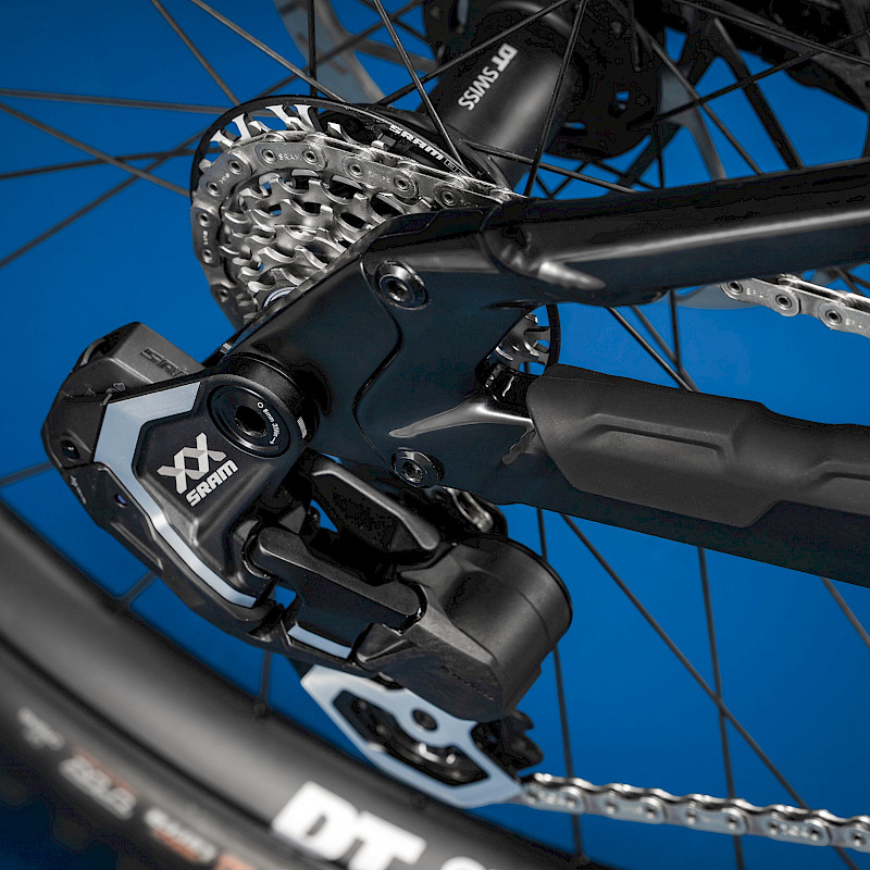 Neu gestaltete Gummi-Protektoren an Kettenstrebe, Unterrohr und Tretlager reduzieren die Geräuschentwicklung und schützen den Rahmen vor Stößen und Schmutzpartikeln. Der zusätzliche Unterrohrschutz verhindert Schäden durch den Sessellift oder beim Einladen in den Van.